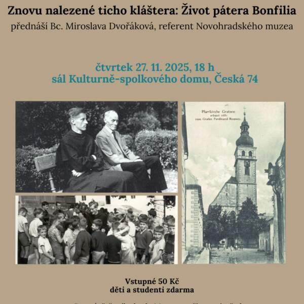 Přednášet bude Bc. Miroslava Dvořáková, referent Novohradského muzea a seznámí nás s životem pátera Bonfilia. Přednáška bude koncipována jako odraz toho, co lze 20 let po jeho smrti najít jak v dobovém tisku, tak například i v krásné literatuře či dnes již v archivech internetu. Zároveň bychom byli rádi, kdyby se nejednalo pouze o přednášku v typickém slova smyslu, ale abyste se zapojili i Vy a podělili se s námi o svou vzpomínku na tak významného člověka.