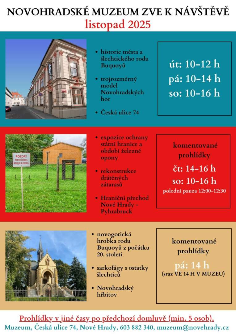 Aktuální otevírací doba Novohradského muzea a jeho expozic v listopadu 2025.
